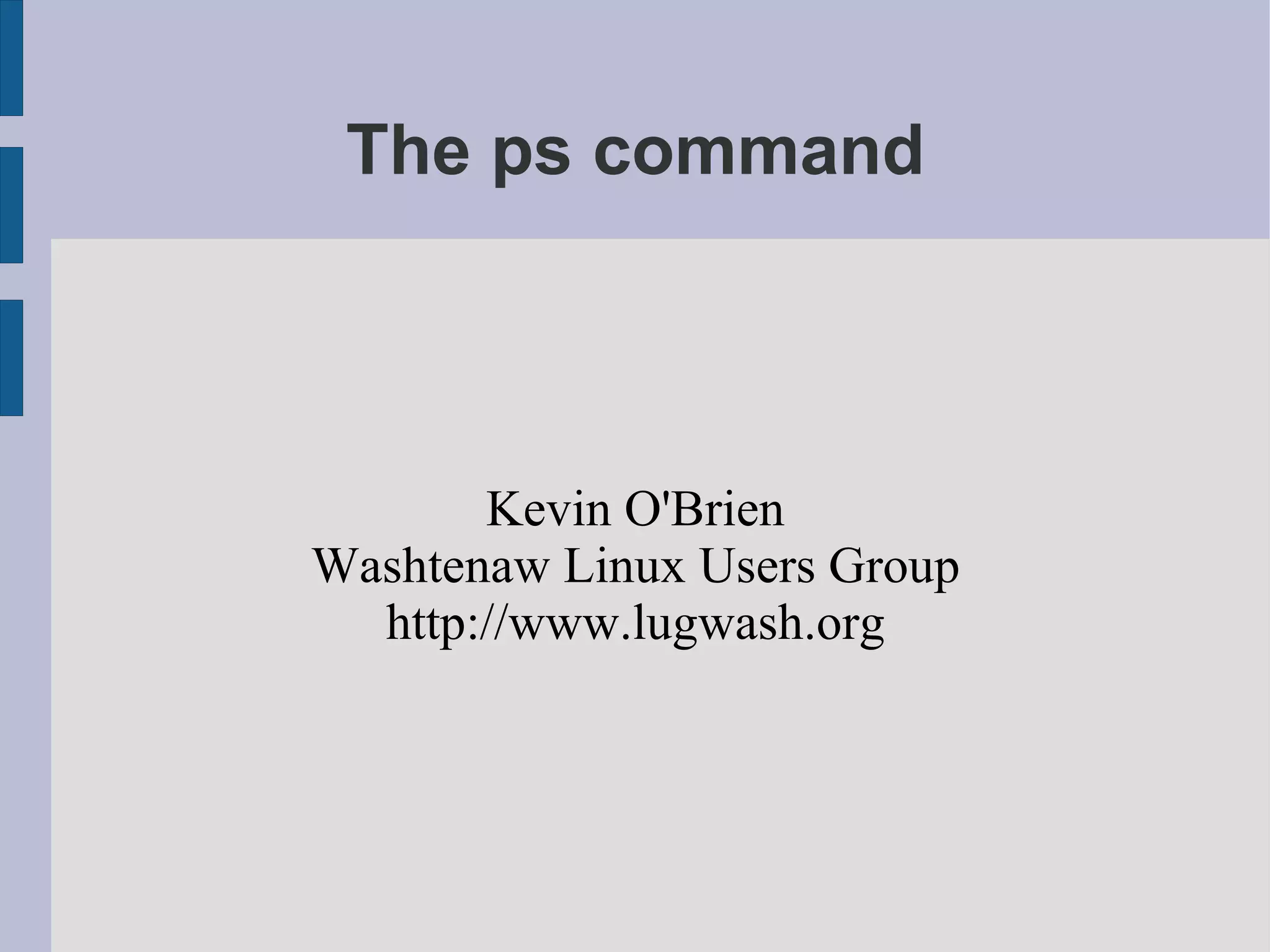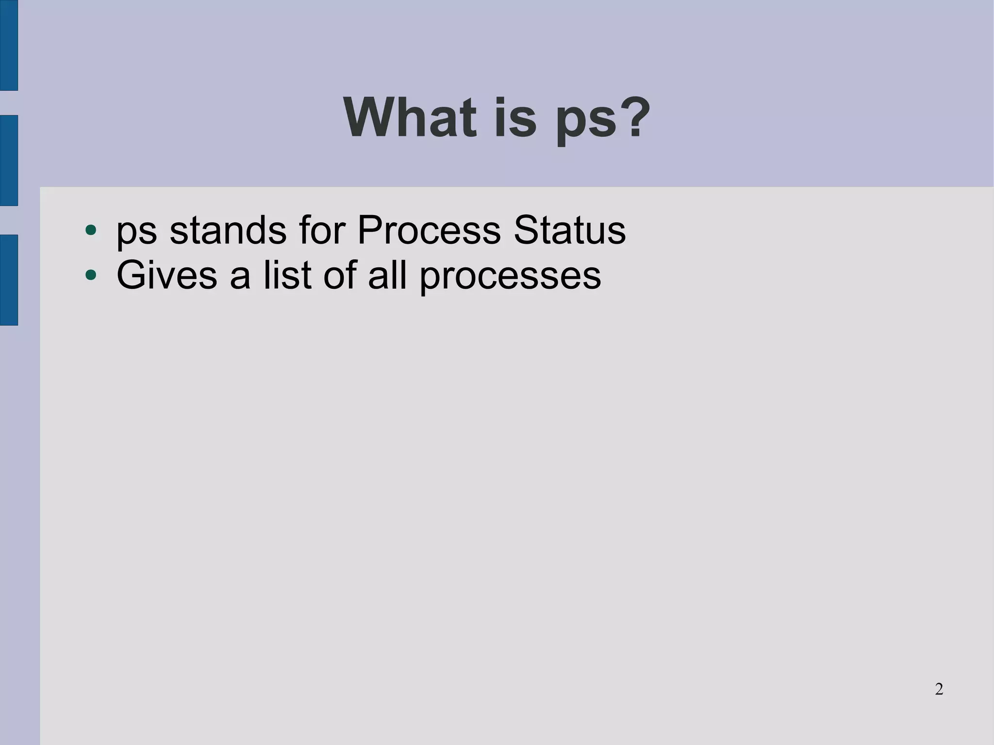 The ps command displays information about active processes. It lists all running processes by default but additional switches provide more details. Common switches include -A for a complete list, -f for full details, and -l for a long listing. The ps command is often used to find the process ID (PID) of a frozen process so it can be killed using the kill command. Piping ps output to grep can filter results to quickly find a specific process.