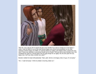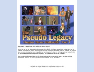 This document provides an overview of events in Chapter 3 of the Pseudo Legacy story. It introduces several new characters on Brody's first day at college, including Tamara who takes an interest in Brody, and Heather the zombie who becomes his friend. Tamara is hostile towards Heather and gets in a fight with her, revealing she had a past with Brody's father. Brody decides to move out of the dorms to the Greek house. The chapter also checks in on Kirstial's mansion, where the werewolves Balin and Allegra spy on her.