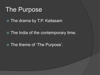 This document provides information about a student submitting an assignment. It includes the student's name, roll number, program details, email address, and the name of the professor and university. The assignment is about analyzing the themes, language, characters, and comparisons to ancient and modern education systems in the Tamil drama "The Purpose" by T.P. Kailasam. Contact information for the student's social media and blogs related to assignments and presentations is also provided.