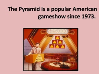 The document describes the rules of the game show The Pyramid, which has been popular in the US since 1973. Contestants have two minutes to guess six past tense verbs from clues provided by their partner without saying the verb. Correct guesses earn points, and the contestant with the most points after all rounds wins. The document provides examples of clues and guesses from four contestant pairs.