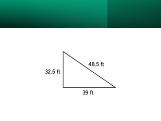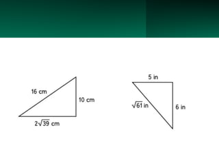 The document discusses the Pythagorean Theorem, illustrating its application in various real-life scenarios, such as calculating distances involving right triangles. It includes examples, exercises, and problems related to right triangles, including how to apply trigonometric ratios. Additionally, it provides practical applications and scenarios, including architecture and surveying tasks that utilize the theorem.