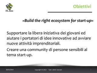 Il documento presenta il piano operativo 2014 di The Qube, mirato a supportare giovani imprenditori e a creare una comunità attiva nel settore delle start-up. Sono descritte le attività previste per il 2014, tra cui eventi e programmi di mentorship, e viene fornita un'opportunità di associazione per partecipare e contribuire alla comunità. Inoltre, il documento sottolinea l'importanza di collaborare e fare rete tra membri e mentor.
