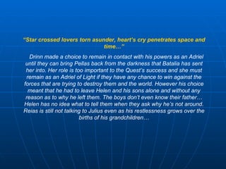 Diamos asks Perseus for help bringing Pellas back from darkness. Diamos needs to possess Perseus' body to return to the earth realm, as his own form no longer exists there. Perseus is hesitant but agrees, hoping it can help restore sunlight and aid the others. Meanwhile, Adahy and Ani-Mei are expecting another child on Elvendia, while Drinn learns more about the threat of Chaos from Maritol and Arwyn.