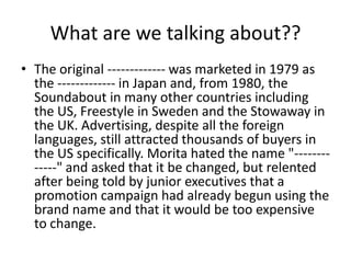 This document contains a quiz with multiple choice and fill-in-the-blank questions about various topics. Some of the questions identify the first Walkman, the company that produced the most cars annually from 1998-2014 (Nissan), the location of the first World Cup final (Uruguay), and the last cell in an Excel spreadsheet (XFD1048576). It also includes fill-in-the-blank details about the career of Jonathan Ive, the chief designer at Apple.