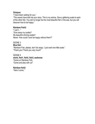 The Rainbow Fish was the most beautiful fish in the sea due to his colorful, shiny scales. However, he was lonely because his scales made the other fish feel inferior. When a small blue fish asks for a scale, the Rainbow Fish refuses angrily. Later, a wise octopus tells the Rainbow Fish to share his scales to find happiness. Reluctantly, the Rainbow Fish gives a scale to the blue fish and discovers joy in sharing. He then gives scales to all the other fish. Though now less colorful, the Rainbow Fish is happy and accepted by his new friends.