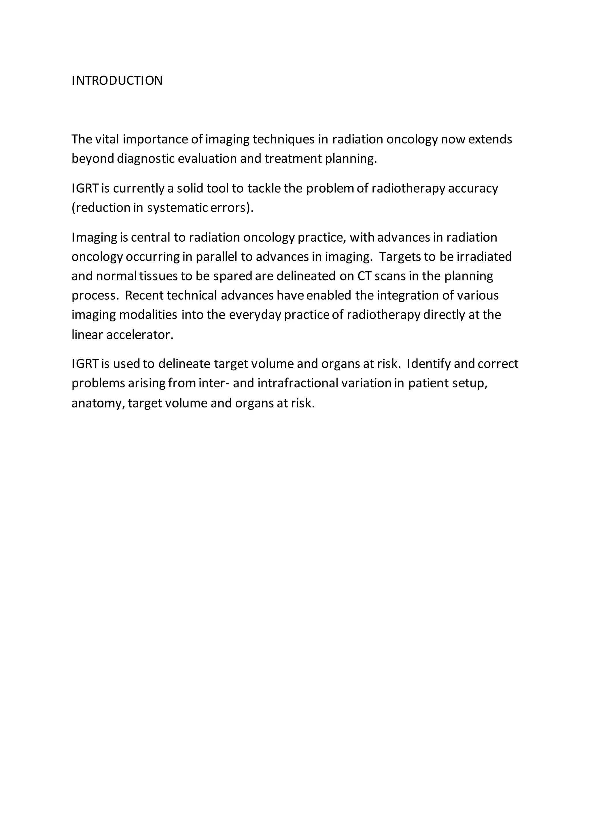 IGRT (Image-Guided Radiotherapy) uses x-rays and scans before and during radiation therapy to more precisely target tumors and reduce radiation exposure to healthy tissues. IGRT allows doctors to detect and correct errors in patient positioning and account for changes in tumor size or position during treatment. This improves accuracy and allows higher radiation doses to tumors or reduced margins around tumors, lowering toxicity risks and improving patient outcomes and quality of life. While requiring additional resources, IGRT has become a standard part of radiation therapy by improving precision and reducing uncertainties.