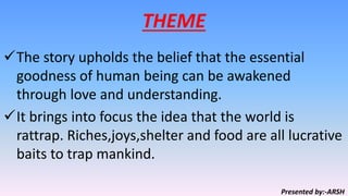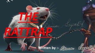 The Rattrap is a short story that uses metaphor to illustrate how people can become trapped by material pleasures in life. The story follows a peddler who sells rat traps and sees the world as one big trap. He steals money from an old man who gave him shelter but then becomes lost in the woods. The peddler finds work and shelter at a nearby iron mill. The mill owner mistakes the peddler for an old friend and invites him to spend Christmas at his home, where the peddler is treated kindly by the owner's daughter Edla. Her kindness and compassion ultimately help free the peddler from being trapped by his own hard life.