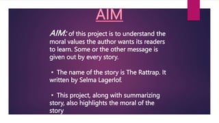 The document discusses 'The Rattrap' by Selma Lagerlöf, a Swedish writer who won the Nobel Prize in Literature in 1909. The story follows a peddler who, living a miserable life, steals money from an old crofter and reflects on how the world acts like a rattrap that lures people with material temptations. Ultimately, through kindness and understanding from the ironmaster's daughter, he redeems himself, illustrating the theme that inherent goodness can be awakened in anyone.