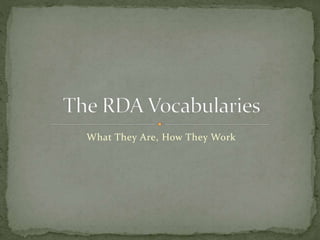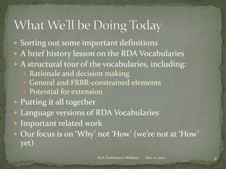 The document discusses RDA vocabularies and their structure when represented in RDF. It explains that RDA properties are declared as a generalized vocabulary without explicit relationships to FRBR entities, and subproperties can then be explicitly related to FRBR entities. This allows the vocabularies to be used more broadly by both library and non-library implementers. It also discusses how aggregated RDA statements like publication statements are represented, either through pre-coordinated subproperties or by using RDA syntax encoding schemes. The generalized approach makes the vocabularies more flexible and extensible.