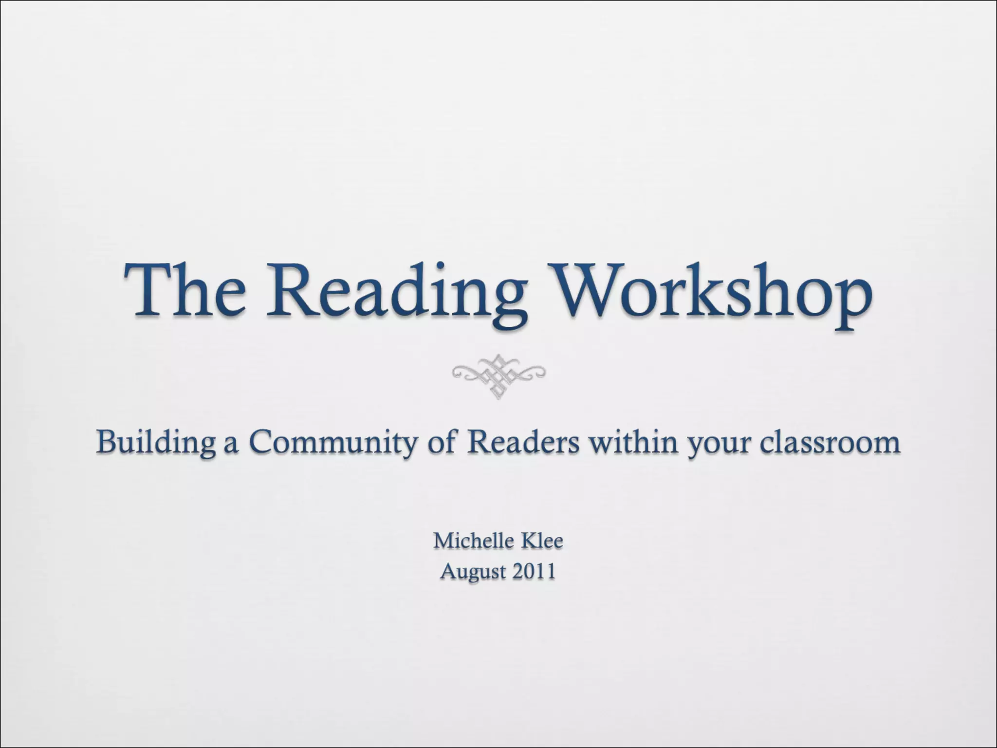 The document provides an overview of the key components of a Reader's Workshop model for literacy instruction. It discusses the mini lesson, conferencing, small group work, read alouds, independent reading, and classroom library setup. It emphasizes that Reader's Workshop allows teachers to meet the needs of diverse students through choice, differentiated instruction, and providing access to books at students' reading levels.