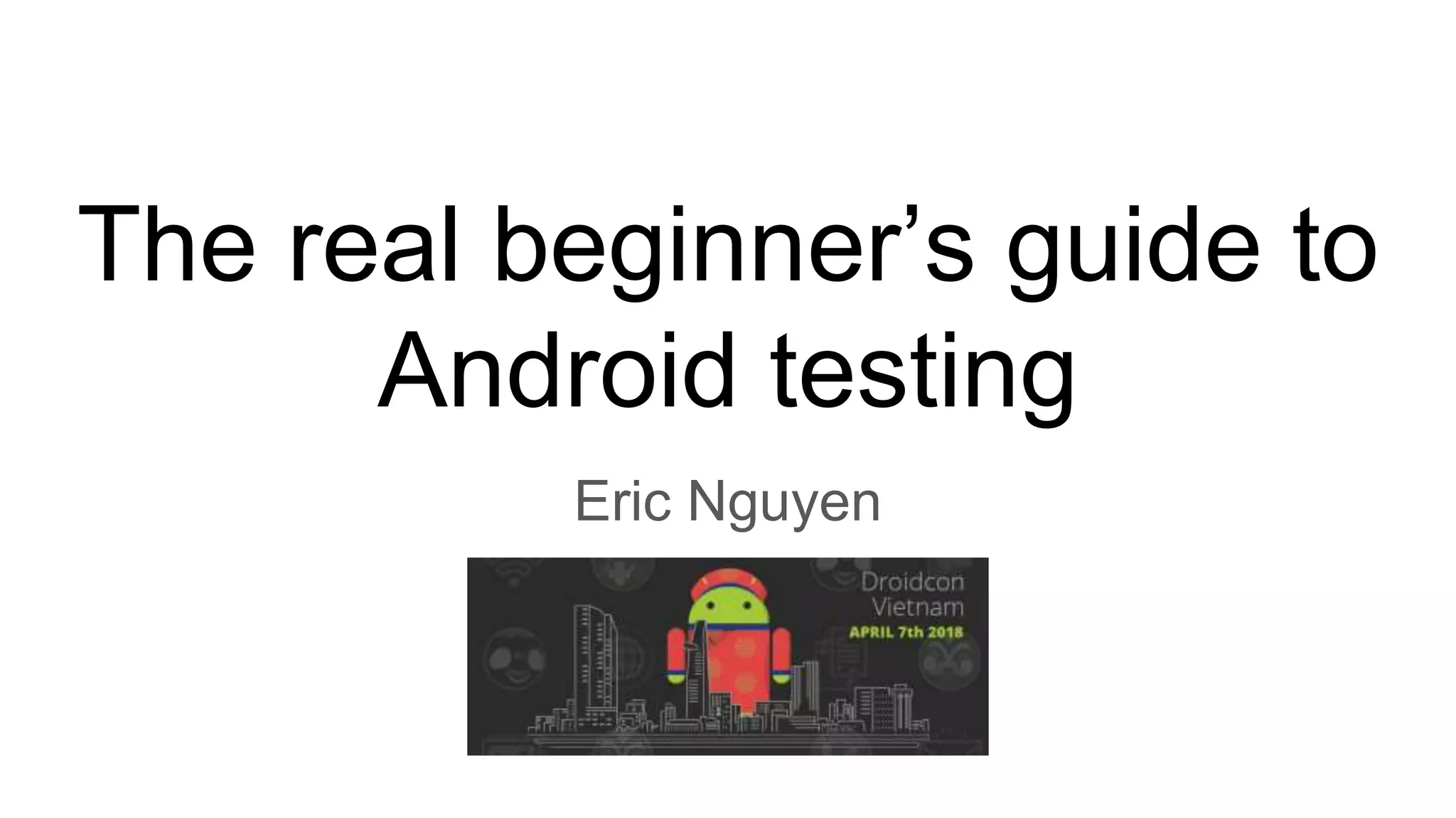 The document is a comprehensive beginner's guide to Android testing, focusing on unit testing and the importance of writing tests to improve software quality. It discusses various types of tests, challenges specific to unit testing in Android, and provides solutions, such as transitioning from MVC to MVP architecture for better testability. Additionally, it includes practical coding examples and outlines steps to implement unit testing in an Android application.