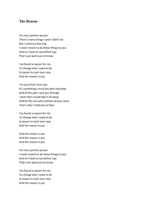 The singer expresses regret for past mistakes and hurting someone, saying they wish they could take it all back. They want the person to know they've found a reason to change and be a better person - and that reason is the person they're singing to. The singer apologizes and says they live with the pain of their actions every day, but they're using it as motivation to start over and show a better side of themselves, and the reason they want to change is because of their feelings for this person.