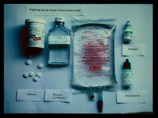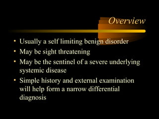 This document provides an overview of common causes of a red eye and guidelines for evaluation and management. It discusses various conditions that can affect the eyelids, conjunctiva, sclera, cornea, iris and anterior chamber. Conditions range from self-limiting issues like blepharitis, styes and viral conjunctivitis to more serious conditions like bacterial ulcers, iritis, uveitis and acute angle closure glaucoma which require prompt referral. A basic history of symptoms and external exam can help form a differential diagnosis, while fluorescein staining aids examination of the cornea. Early referral is advised for decreased vision, severe pain, poor response to initial treatment or unilateral red eye.