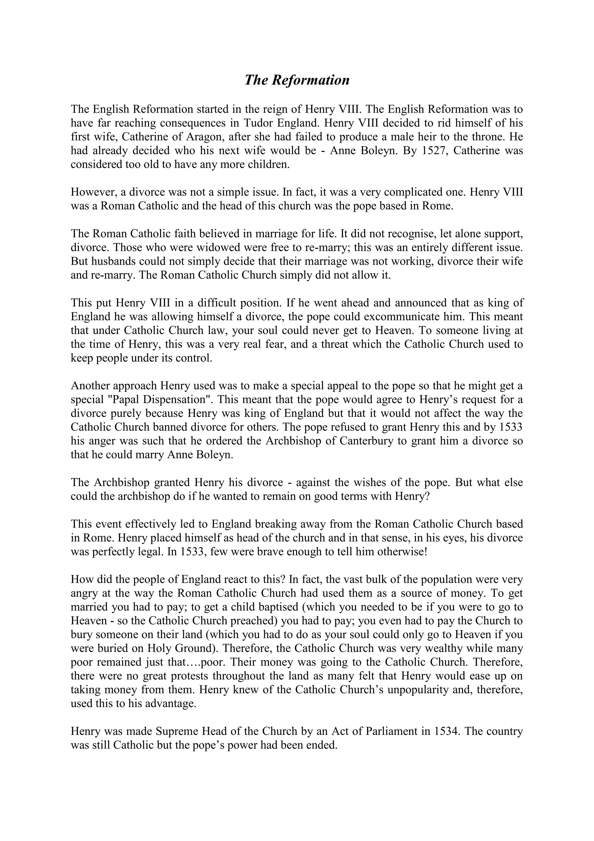 The English Reformation started when Henry VIII decided to divorce his first wife Catherine of Aragon after she failed to produce a male heir. However, divorce was not allowed by the Roman Catholic Church, so Henry broke ties with Rome and declared himself head of the Church of England. This led him to dissolve the monasteries and confiscate church lands and wealth, which increased his power but angered Roman Catholic leaders. The Reformation transformed the English church from answering to the Pope to being governed by the monarch.