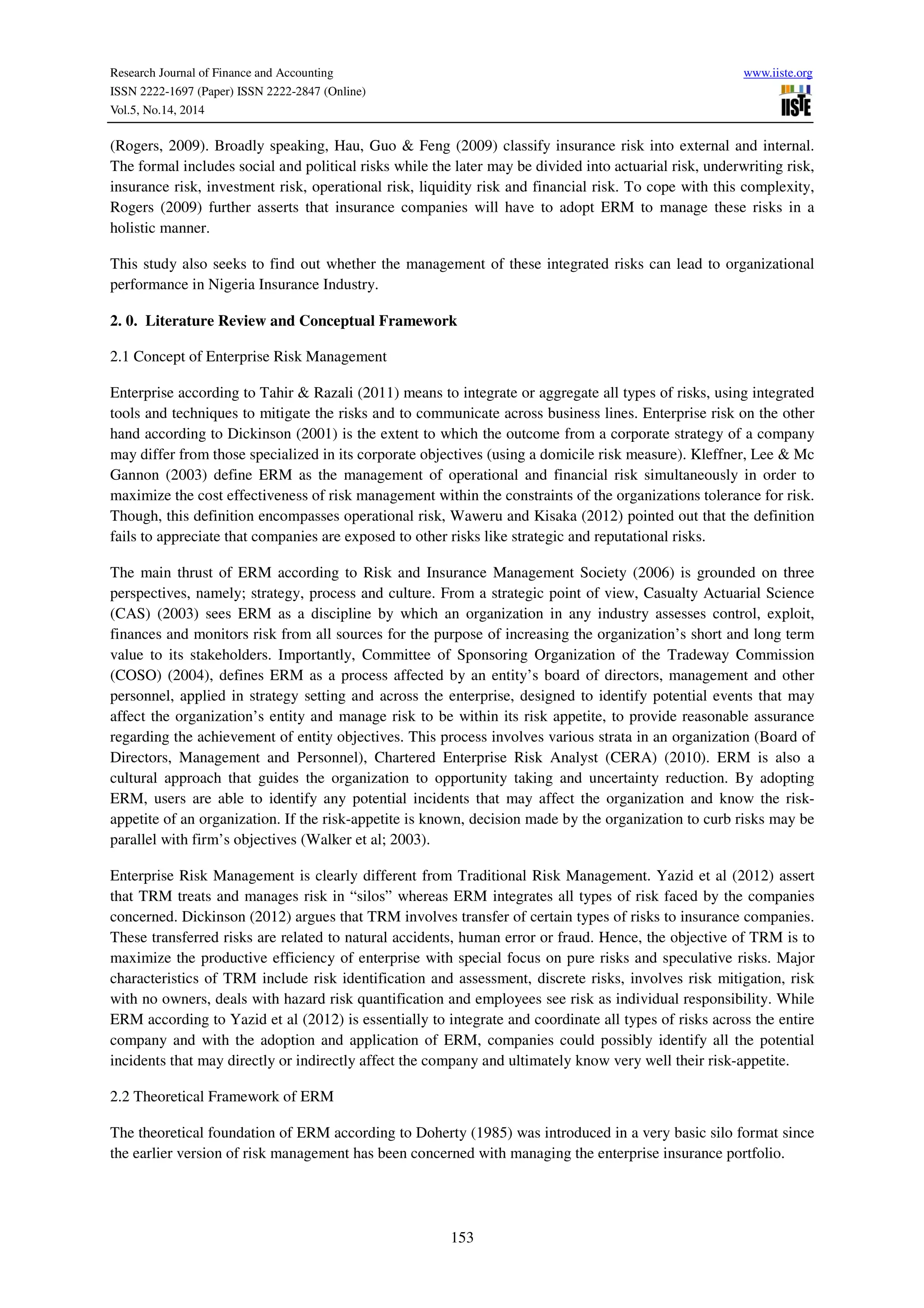 This document summarizes a research study that examines the relationship between enterprise risk management (ERM) and organizational performance in the Nigerian insurance industry from 2001-2010. The study uses secondary data from 10 general insurance companies in Nigeria. It measures ERM using indicators like contingency reserve, shareholders' fund, gross premium and net premium. The study finds a joint relationship between the ERM variables and organizational performance, though the individual relationships differed. It recommends Nigerian insurers adopt ERM to boost performance and reputation.