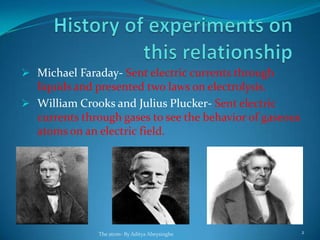 1) Scientists like Faraday, Crookes, and Plucker studied the behavior of atoms and molecules using electric currents passed through liquids and gases.
