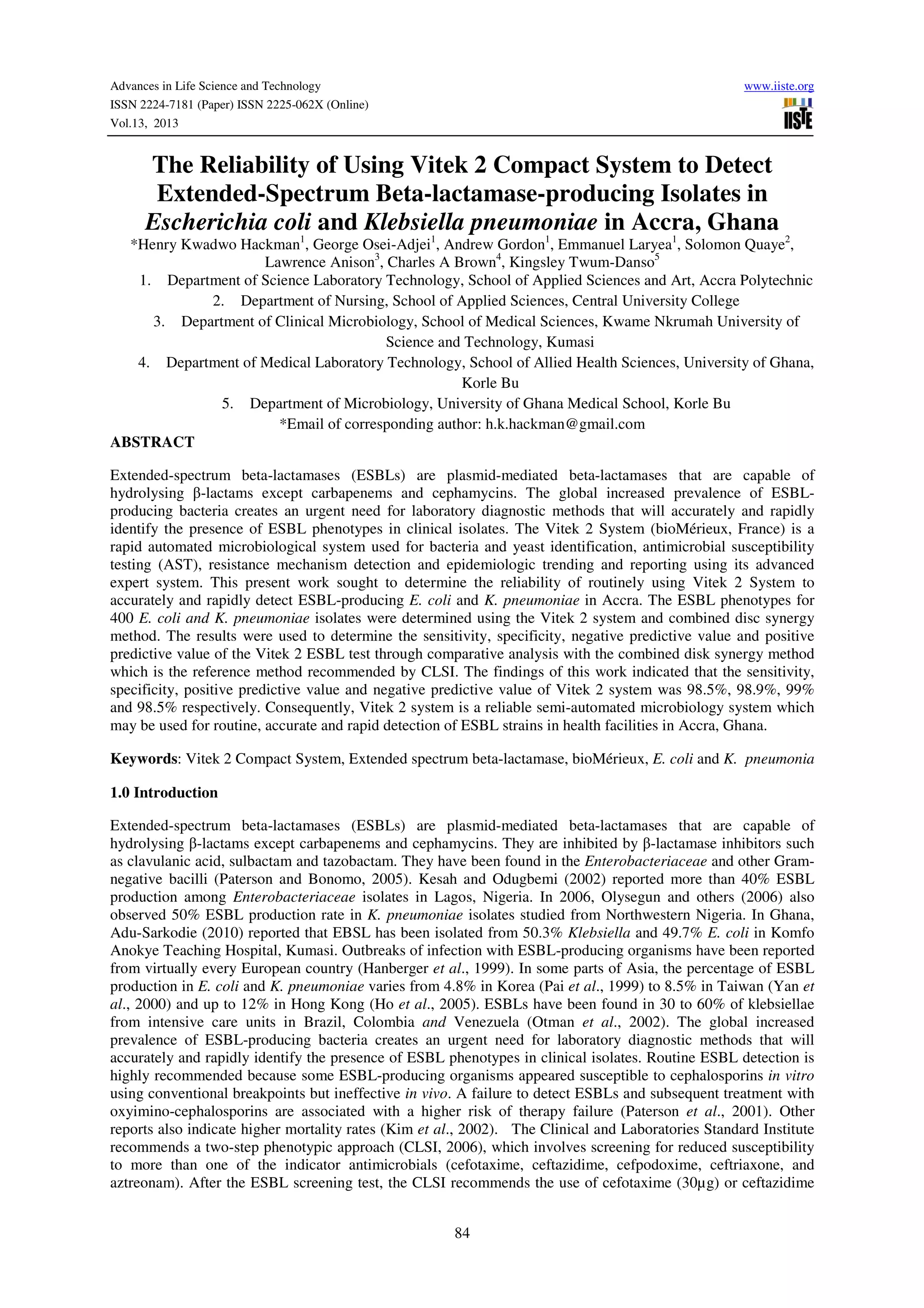 The study aimed to determine the reliability of the Vitek 2 system for detecting extended-spectrum beta-lactamase (ESBL)-producing Escherichia coli and Klebsiella pneumoniae isolates in Accra, Ghana. 400 E. coli and K. pneumoniae isolates were tested for ESBL phenotypes using the Vitek 2 system and combined disk synergy method. The Vitek 2 system detected 202 ESBL producers with a sensitivity of 98.5%, specificity of 98.9%, positive predictive value of 99% and negative predictive value of 98.5% compared to the reference combined disk synergy method. Therefore, the Vitek 2 system is a reliable method for the rapid and accurate