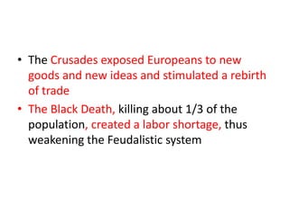 The Renaissance period from 1400-1600 saw a rebirth of interest in classical antiquity in art and intellectual pursuits. The Black Death and Crusades weakened the feudal system and exposed Europeans to new ideas. In Italy, wealthy patrons supported artists and scholars, leading to more realistic paintings and sculptures that glorified the human form. The printing press allowed mass-production of books and spread of new ideas, while scientific thinkers like Copernicus and Galileo challenged the Church's authority. The Protestant Reformation led by Luther and Calvin further questioned the Catholic Church, dividing Europe along religious lines.