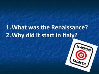 The Renaissance began in 14th century Italy as a period of cultural and intellectual revival following the Middle Ages. It spread across Europe in the 15th and 16th centuries. The Renaissance sought to revive ideas and values from classical antiquity, with a focus on human potential and achievements. Notable Renaissance artists like Michelangelo, Raphael, and Leonardo da Vinci developed new techniques like linear perspective and studied human anatomy to portray figures in unprecedented realism and detail. Their works, including Michelangelo's Sistine Chapel and David, and da Vinci's Mona Lisa and Last Supper, had a profound influence on Western art and culture.