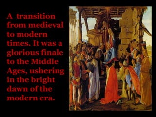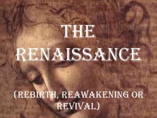The document provides an overview of the Renaissance period in Europe. It summarizes that the Renaissance was a period of transition from the Middle Ages to modern times where European nations rediscovered ancient Greek and Roman culture. Italy is identified as the birthplace of the Renaissance due to its proximity to ancient Rome. The document then highlights some of the key aspects of the Renaissance including Humanism, important figures like Petrarch and Machiavelli, the spread of Renaissance ideas, developments in art, architecture, literature and more. It concludes by noting some of the effects the Renaissance had, like sparking the intellectual revolution and paving the way for the Protestant Reformation.