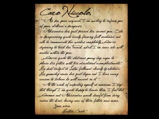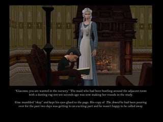 Giacomo reads to his young sister Alessandra in the nursery on her birthday and teaches her a French nursery rhyme, though she finds it difficult. Niccolo Moretti receives letters from his son Giacomo, who writes to him often from boarding school, as well as a letter from Heather. Niccolo's brother Giusseppe visits and encourages Niccolo to remarry and provide a mother for his children, which gives Niccolo something to think about.
