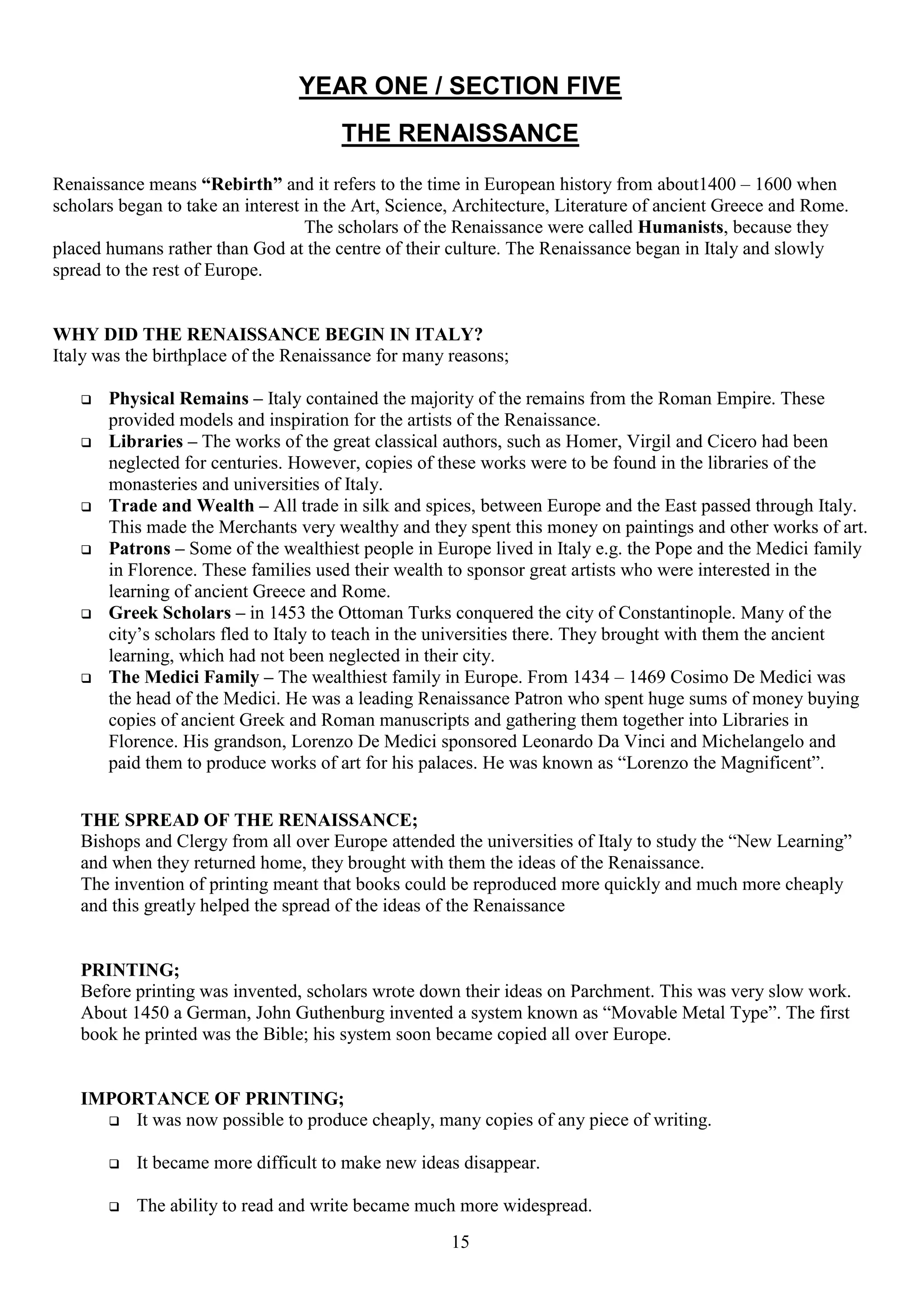 The Renaissance, meaning 'rebirth', was a cultural movement in Europe from 1400 to 1600 that emphasized art, science, and literature inspired by ancient Greece and Rome, beginning in Italy. It was characterized by advancements in various fields including painting, sculpture, and science, influenced by wealthy patrons and the spread of humanist ideas, particularly through the invention of the printing press. Key figures include artists like Leonardo da Vinci and Michelangelo, and scientists like Galileo and Copernicus, who transformed understanding of the world.