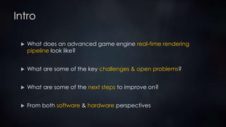 The document discusses the challenges and future directions of real-time rendering pipelines in advanced game engines, highlighting improvements since 2010, such as physically based rendering (PBR) and the use of explicit control APIs like Vulkan and DX12. It emphasizes the increasing complexity of rendering systems, the difficulties in achieving realistic transparency and motion blur effects, and the need for a more unified pipeline to reduce this complexity. The document also outlines potential solutions to enhance rendering efficiency and quality while addressing various technical challenges in graphics rendering.