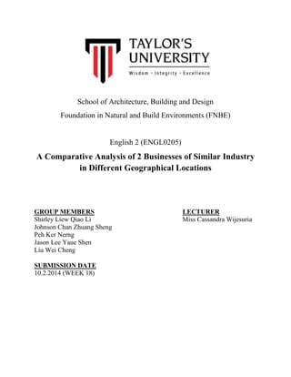 This document provides a comparative analysis of 3 Chinese restaurants: Yut Kee Kopitiam in Kuala Lumpur, Heng Heng Kopitiam in Pontian, Johor, and Kar Heong Restaurant in Petaling Jaya. It summarizes the history and operations of each restaurant, comparing factors like signature dishes, competitive advantages, locations, family involvement, and business strategies. Yut Kee is highlighted as more commercially successful due to maintaining traditional cuisine quality while innovating new dishes, strong bonding with customers, and overcoming challenges through family cooperation over its 86 year history. The analysis provides recommendations for Yut Kee to expand its business and change operations to remain sustainable.