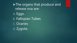 The document is a quiz about the female reproductive system. It asks questions about which organs produce and release eggs (ovaries), where fertilization takes place (fallopian tubes), where the fetus develops (uterus), how often a woman releases an egg (approximately every 28 days), what menstruation is (getting rid of the lining and unfertilized egg), and which listed item is not a change in puberty (pregnancy).