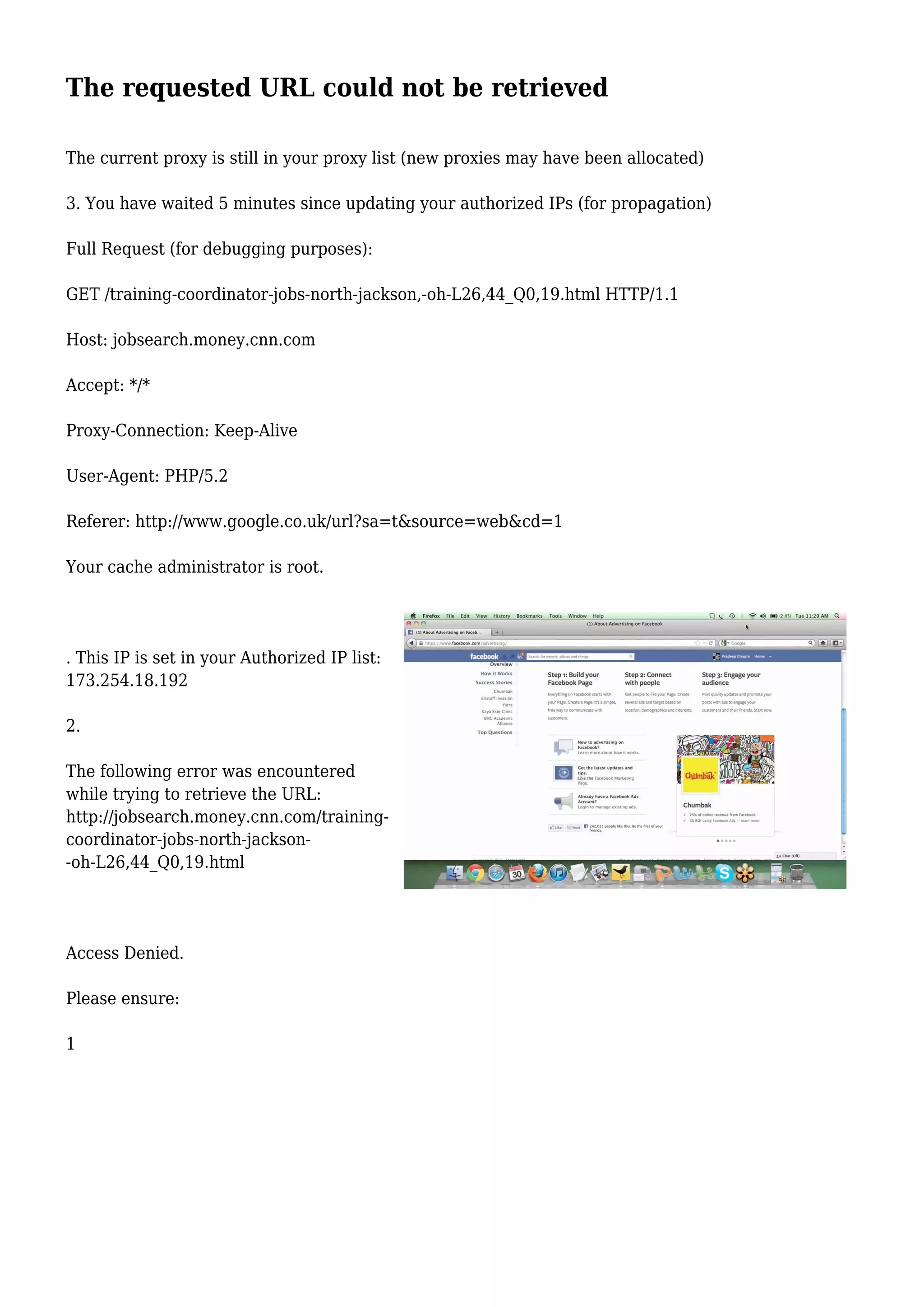 The document details an error encountered while trying to access a specific URL related to training coordinator jobs. It mentions issues with proxy settings and the need to wait for authorization updates. Access to the requested content is denied, and guidance is provided for resolving the issue.