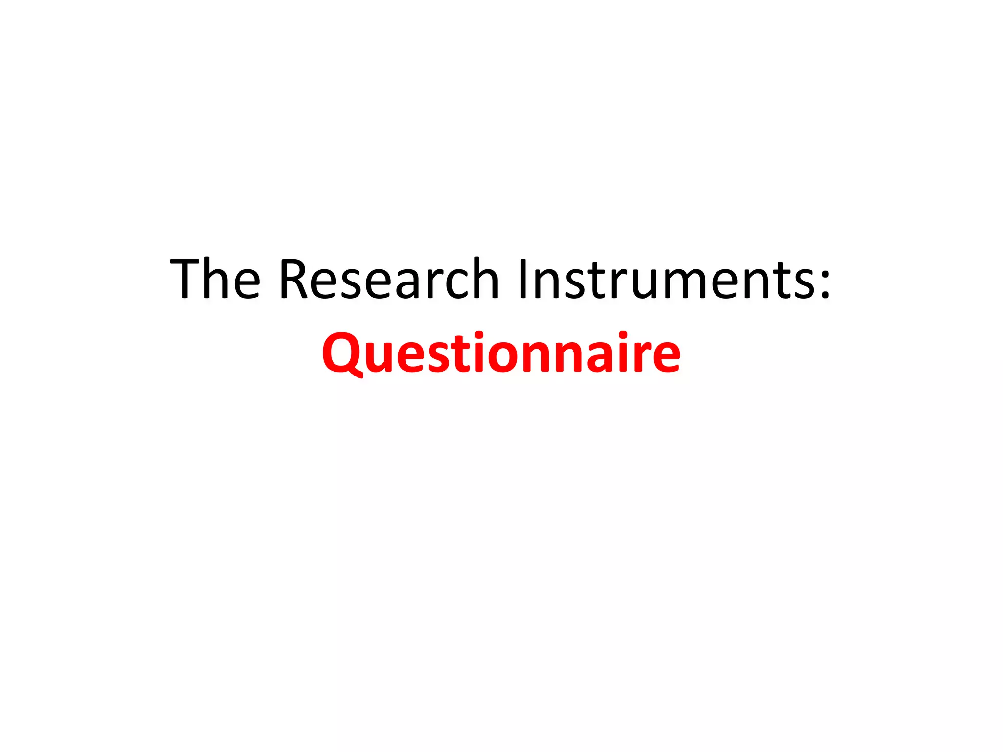 The document discusses research instruments, focusing on questionnaires. It describes questionnaires as one of the most common tools for obtaining data beyond an observer's physical reach. Questionnaires can be sent to people thousands of miles away. They come in closed-form or open-form versions. Guidelines for constructing effective questionnaires include using clear language, singular purpose, relevance to the study objectives, and correct grammar. The document also lists 12 principles for developing questionnaires and discusses advantages like facilitating data gathering, as well as disadvantages such as potential for low response rates.