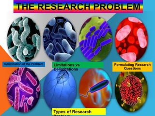 The document discusses the concepts of limitations and delimitations in research, outlining their importance in defining the scope and boundaries of a study. It provides guidance on formulating effective research questions and highlights different types of research questions, such as descriptive, relational, and causal. The document emphasizes the need for thorough analysis and understanding of the research field to develop meaningful inquiries.