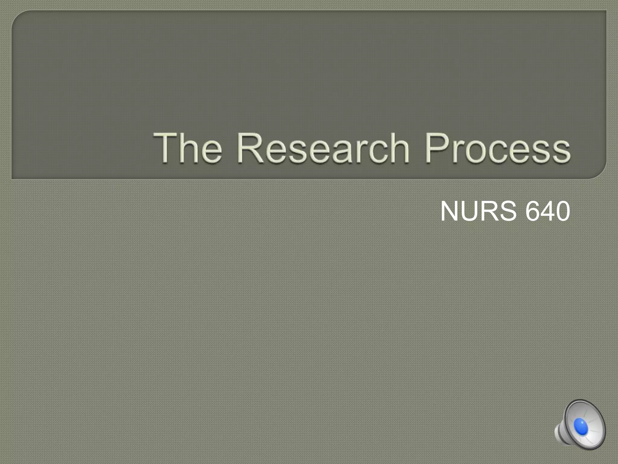 The document discusses the research process for NURS 640 and provides guidance on developing a research topic. It suggests asking questions to identify a topic that is curious or annoying in one's work. A good research topic studies a specific problem, person, or circumstance, and aims to answer how often something occurs, what causes something, or how effective something is. Examples of research topics include shortening wait times, the impact on siblings of hospitalized children, and reducing stress for emergency room patients. An ideal topic is interesting, feasible to study, answers an important unknown, and is specific but not too broad in scope without ethical issues.
