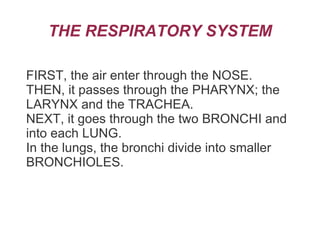 The respiratory system brings oxygen into the body and removes carbon dioxide. Air enters through the nose and passes through the pharynx, larynx, trachea, and bronchi before reaching the lungs. In the lungs, the bronchi divide into smaller bronchioles containing alveoli where oxygen passes from the air into the blood and carbon dioxide is released from the blood and expelled from the body.