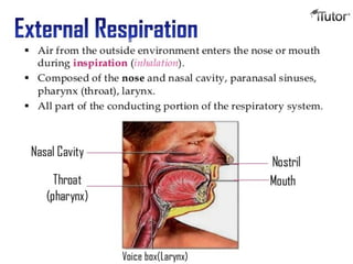 The document provides an overview of the respiratory system, detailing its divisions into the upper and lower respiratory tracts, and the various structures involved, including the nose, larynx, trachea, bronchi, and lungs. It explains the mechanics of breathing, gas exchange, and respiratory volumes, along with the physiological processes of respiration and factors influencing respiratory rates. Additionally, it covers emergency techniques like the Heimlich maneuver and highlights the role of neural and chemical factors in regulating respiration.
