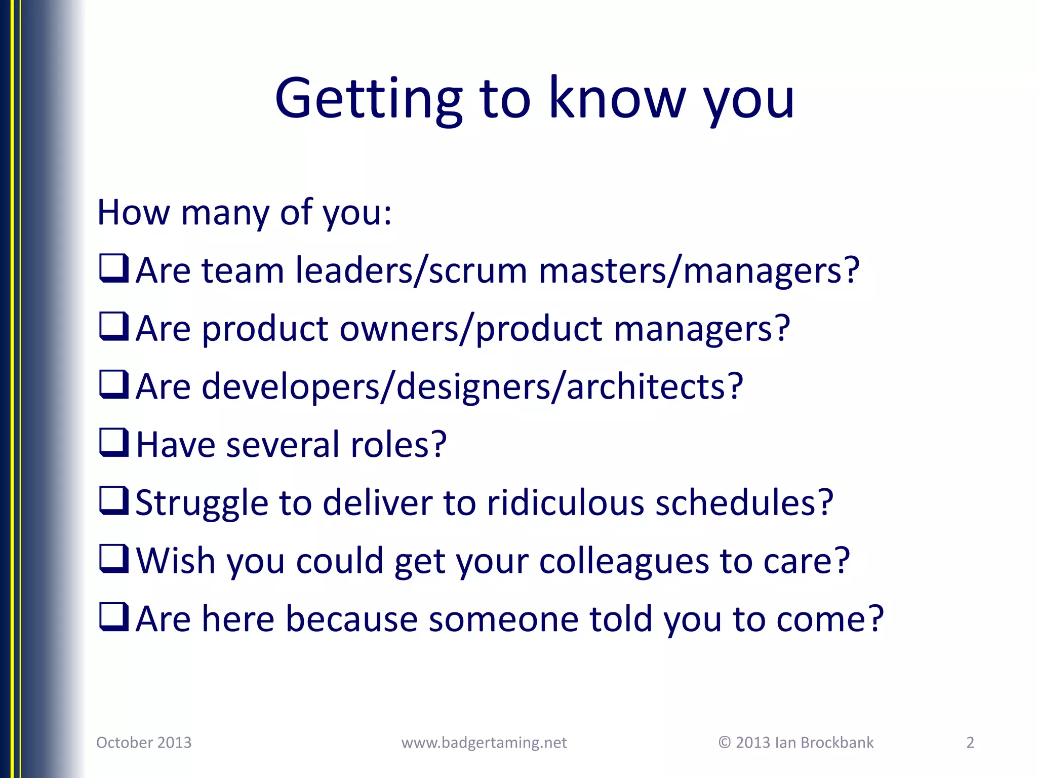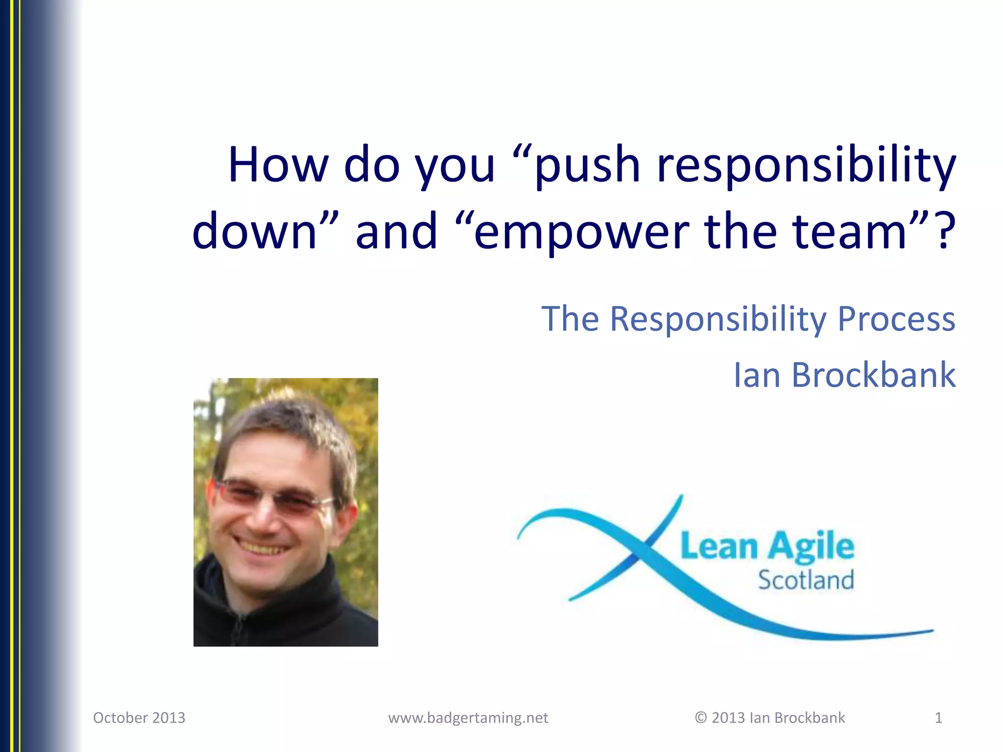 The document discusses the concept of fostering responsibility within teams and the process of empowering them to take ownership of their outcomes. It outlines the stages of the responsibility process, emphasizing that true responsibility cannot be pushed down but must be chosen by individuals. The author, Ian Brockbank, shares insights from his extensive experience in software development and agile practices, urging that fostering a culture of responsibility begins with individual leaders demonstrating accountability and encouraging team commitment.