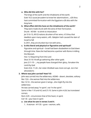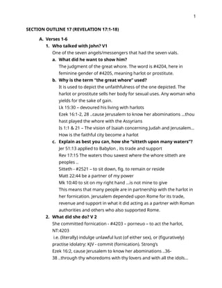 Revelation chapter seventeen begins as one of the seven angel/messengers who had the seven vials speaks with John and tells him he will show John the judgment of the great whore who sat upon many waters. We learn in verse 15 of this chapter that the waters represent people, and multitudes and nations and tongues or languages. Verse two tells us that the kings of the earth committed fornication, which is spiritual in nature through their false gods which she also worshipped. She made the inhabitants of the earth drunk with the wine of her spiritual fornication. So the angel/ messenger carries John in spirit (there is no definite article in the text), into the wilderness where he sees a woman sitting on a scarlet colored beast that is full of names of blasphemy, having seven heads and ten horns. Go to the study to see who this represents. John describes the woman's attire and notices a cup she had and what it contained. A lengthy discussion of who this is, is in the study. Go there to see it. John next describes her name using Babylon as an example. John says he saw this woman drunken with the blood of the saints and the blood of the martyrs of Jesus. From this description it becomes obvious who the woman is. Go to the study to see further proof. In the next several passages, the angel/messenger tells John of the relationship of the woman with the beast. He discusses the seven heads and ten horns and what they represent. Go to the study to see a full explanation of what these things mean. These make war with the Lamb and we are told the outcome. The chapter ends with what happens to the whore and who carries out the sentence. Go to the study for a full scriptural discussion of this.