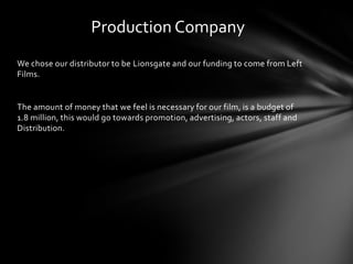 The document outlines plans for a horror film production including distribution through Lionsgate, a budget of $1.8 million, and promotion through social media, film festivals, and advertisements. The target audience is 15-25 year olds who frequently watch horror films. Typical horror character archetypes and locations that would appeal to this audience are discussed to inform the film's development.