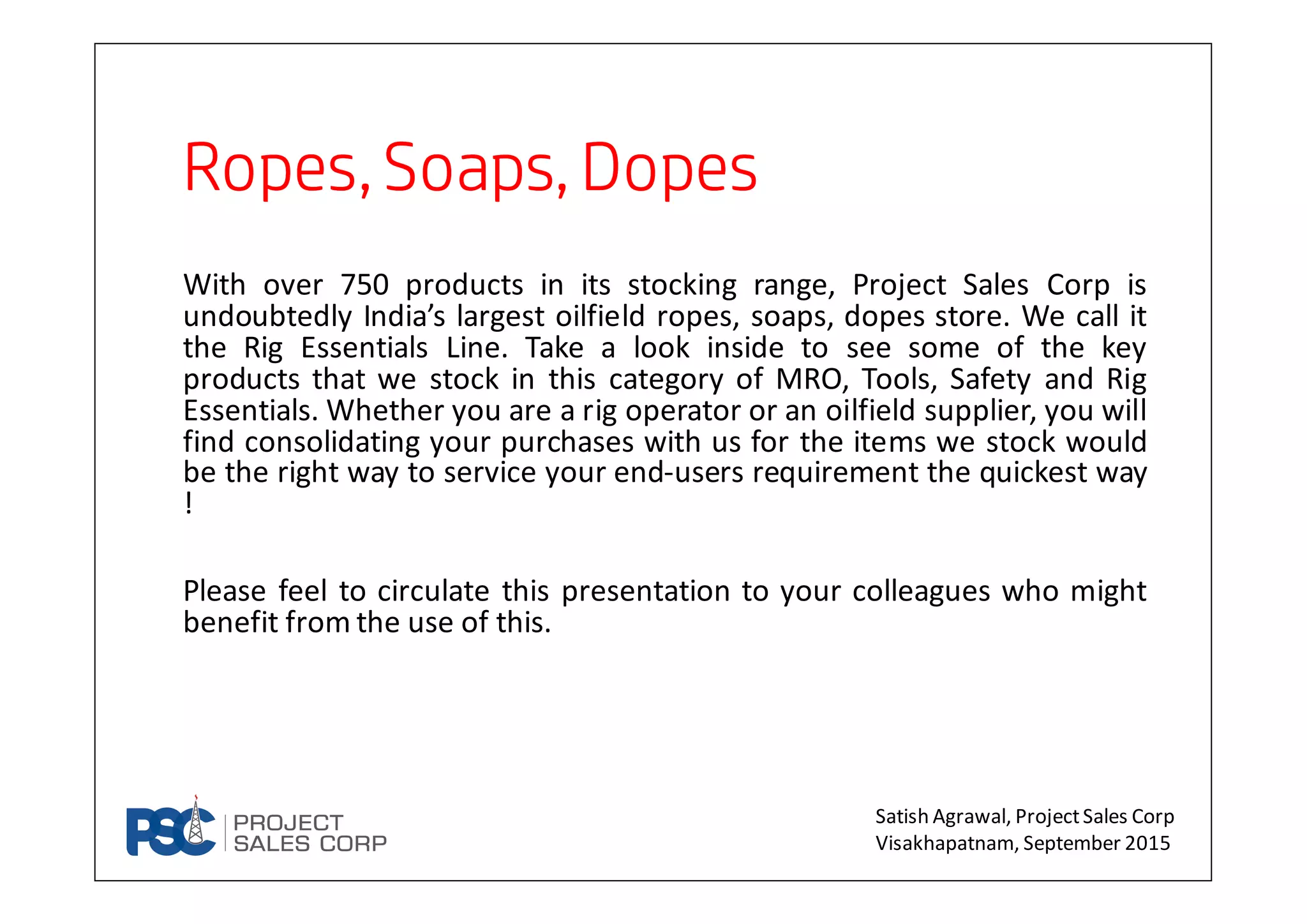 Project Sales Corp is India's largest distributor of oilfield ropes, soaps, and dopes, offering over 750 essential products for rig operations. The company emphasizes the value of investing in quality tools and materials to enhance efficiency, reduce downtime, and ultimately save costs for oilfield operators. Their extensive product range includes gloves, lubricants, safety gear, and spill containment solutions tailored for the oil and gas industry.