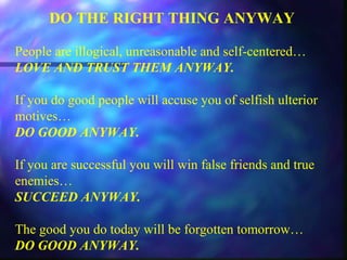 The document provides advice to do good, think big, help people, and give your best regardless of potential negative consequences such as false accusations, gaining enemies, work being forgotten or destroyed, and lack of gratitude or further attacks. It encourages being honest and frank, fighting for underdogs, succeeding, and building things even if faced with illogical, unreasonable, self-centered people or the possibility that small people can take down big ideas.