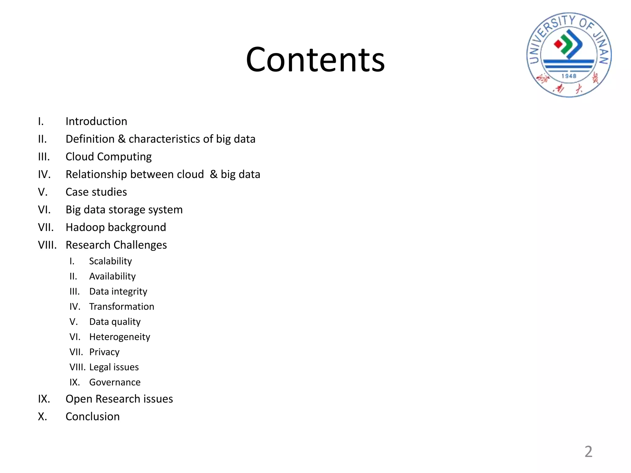 The document discusses the interplay between big data and cloud computing, highlighting the challenges, characteristics, and advantages of both technologies. It details how cloud computing supports big data by enabling scalable storage and processing frameworks like Hadoop. The document concludes that while big data presents significant challenges, cloud technologies offer solutions for efficient data management and analytics.