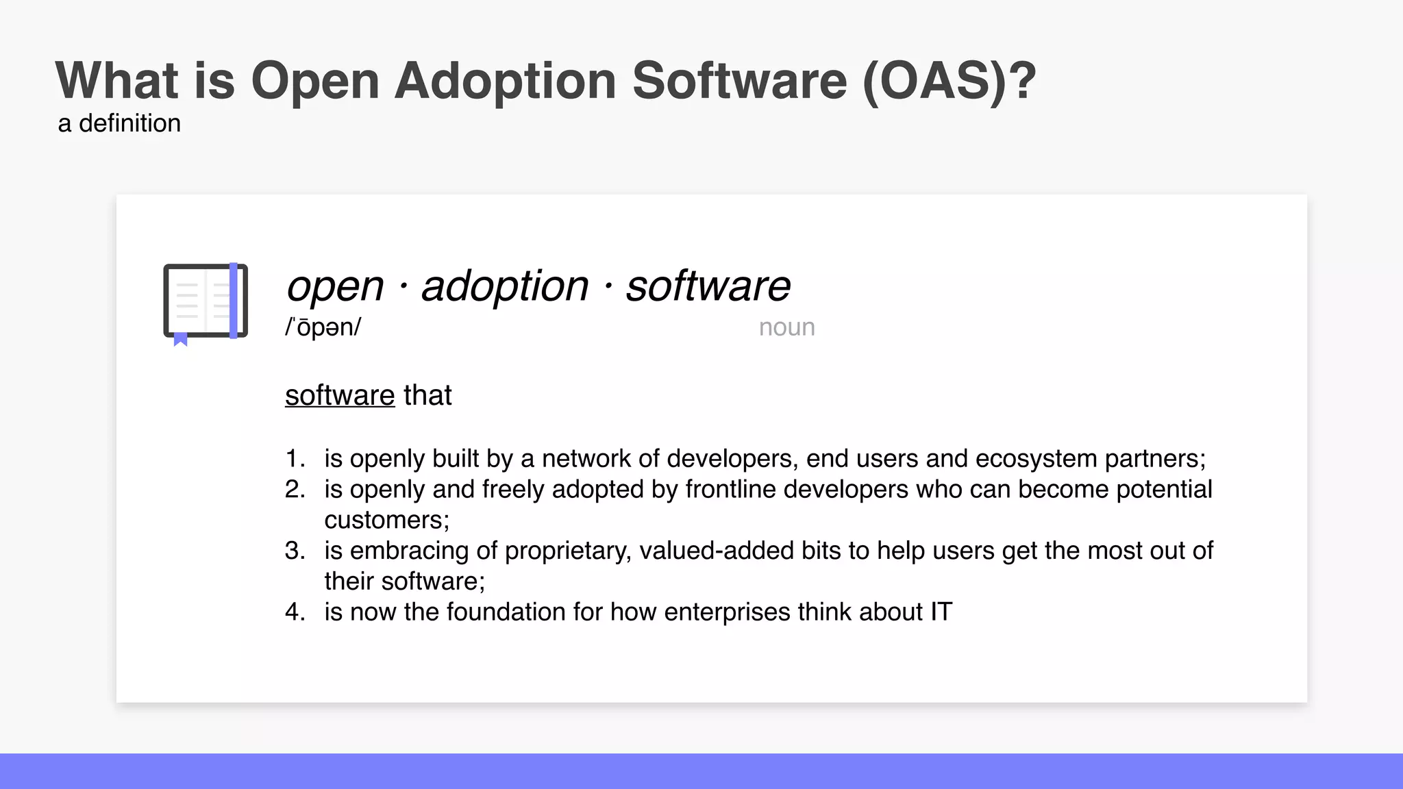 The document discusses the rise of Open Adoption Software (OAS). It defines OAS as software that is openly built by developers and partners, freely adopted by frontline developers, and embraces proprietary additions. The key drivers of OAS include powerful contributor networks, the need for speed and control, and users taking an "open-first" view. Many companies are now using OAS to remodel their IT stacks from the floor to the ceiling. OAS companies can enjoy rapid adoption through communities and become valued at billions, serving both tech and non-tech companies. The document outlines the typical phases and funding stages of OAS companies.