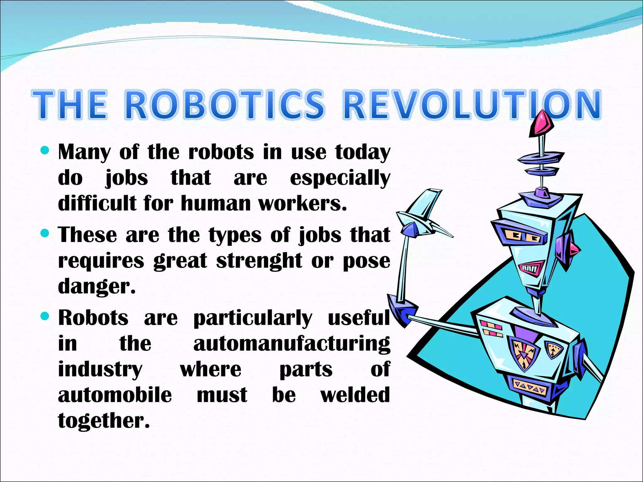 Robots are well-suited for jobs that are dangerous, require great strength, or involve repetitive tasks like assembly. They excel at jobs like welding automobile parts, spray painting due to their ability to work in hazardous environments without negative effects, and precisely installing electronic chips. While robot technology continues to advance, their capabilities are still limited compared to the capabilities evolved in human and animal biology over hundreds of millions of years.