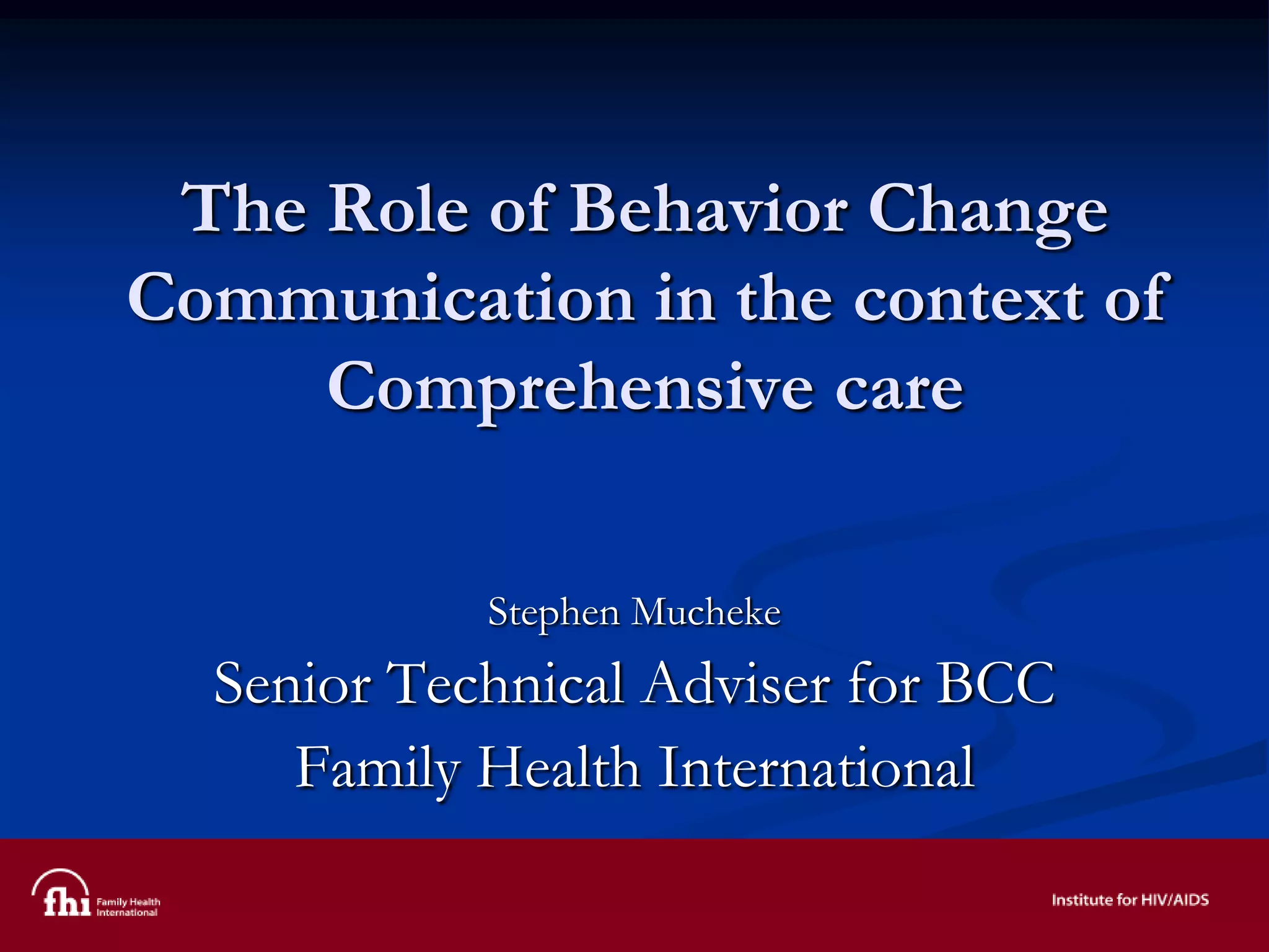 This document discusses the role of behavior change communication (BCC), now called strategic behavioral communication (SBC), in the context of comprehensive HIV/AIDS care. It outlines how SBC can support various elements of care including prevention, counseling and testing, prevention of mother-to-child transmission, antiretroviral therapy, tuberculosis and other opportunistic infection treatment, home-based care, and support for orphans and vulnerable children. The objectives of SBC are to provide information to stimulate behavior change, increase access to services, promote adherence, and reduce stigma across the continuum of HIV prevention, care, and treatment.