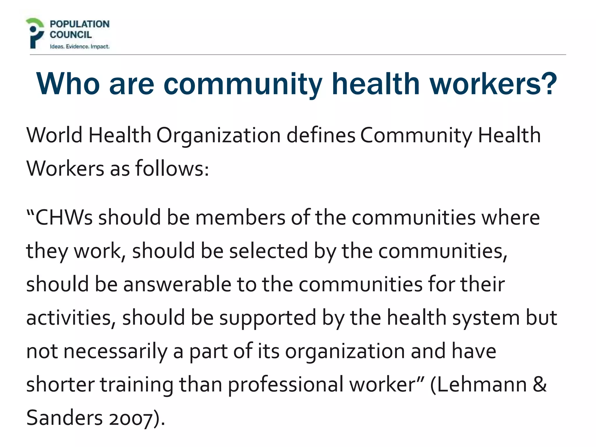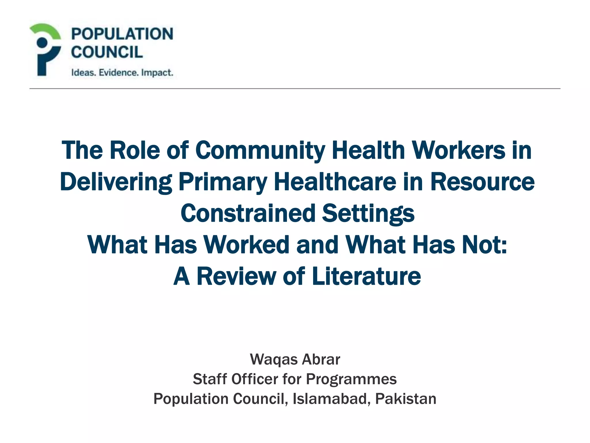 This document reviews the role of community health workers in delivering primary healthcare, particularly in resource-constrained settings. It defines community health workers as members of the communities they serve, selected by those communities to implement health interventions according to local norms. Globally there are approximately 1-5 million unpaid and paid community health workers. The review aims to identify strengths of community health worker programs, factors ensuring community acceptance and ownership, and factors relating to their effectiveness. It provides examples of successful community health worker programs from different countries and discusses incentives and factors that help or hinder community health workers. The document concludes by recommending Pakistan establish standards and integrate community health workers into its provincial health strategy to expand healthcare access.