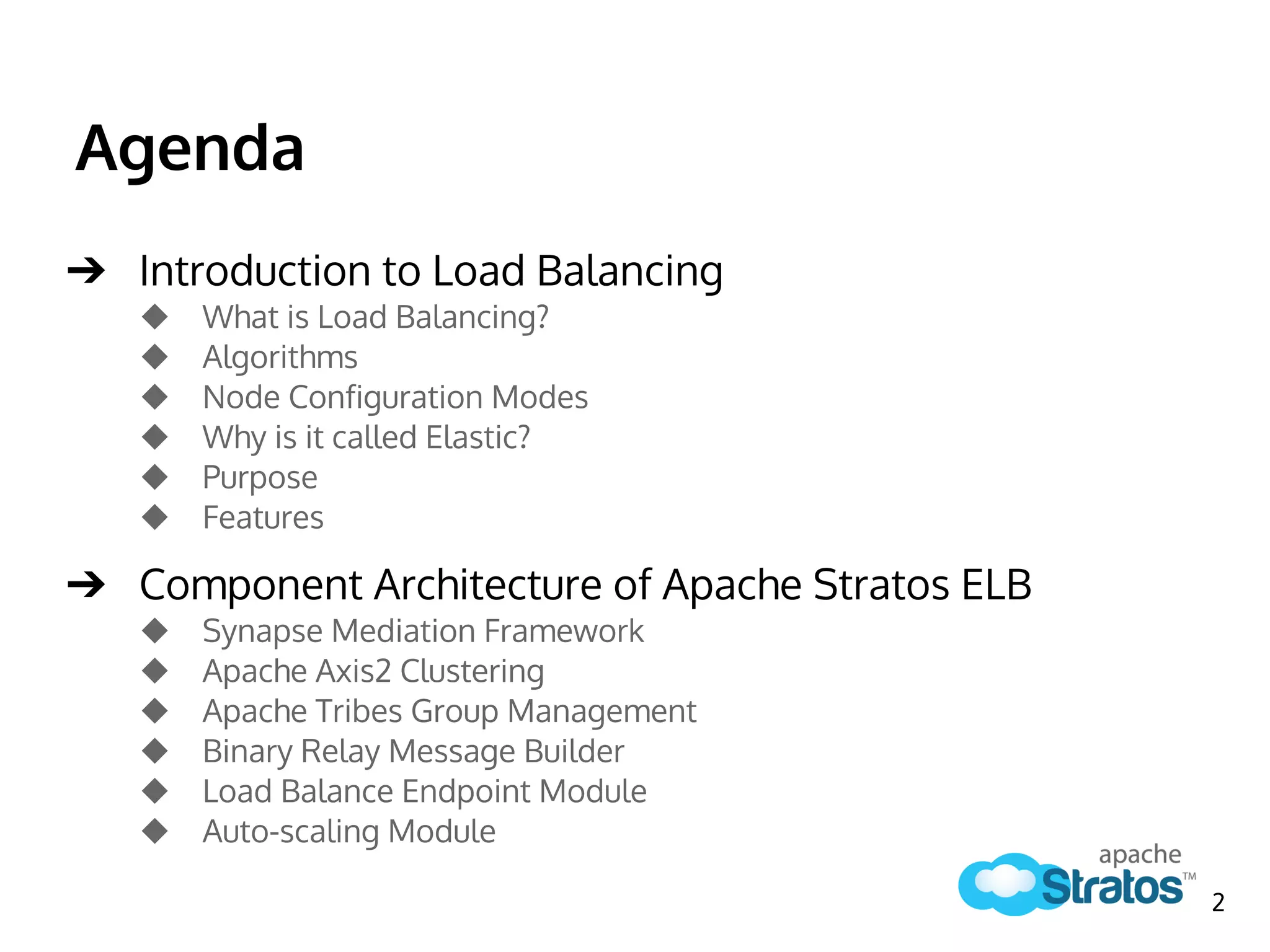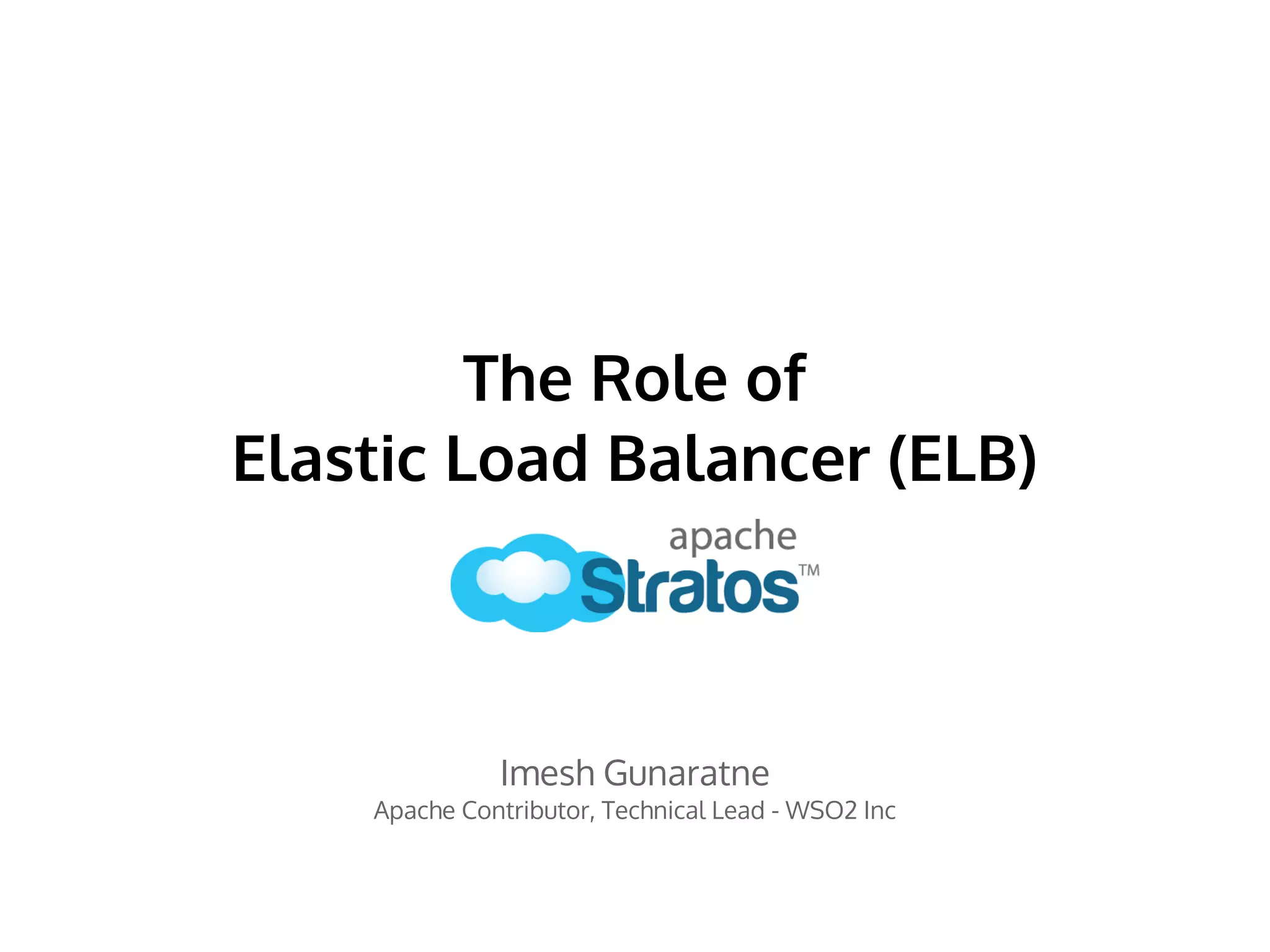 The document discusses the role of the Elastic Load Balancer (ELB) in Apache Stratos PaaS. It describes how the ELB uses components like Synapse, Axis2, and Tribes to distribute incoming traffic across backend nodes and auto-scale capacity. The ELB handles load balancing, failover, auto-scaling, and multi-tenancy. It integrates with Stratos by receiving topology information, load balancing requests to cartridge instances, and auto-scaling the number of instances based on traffic.