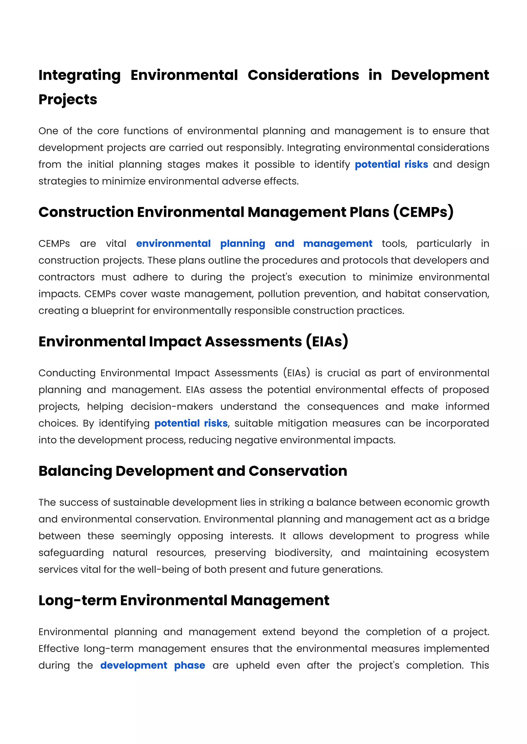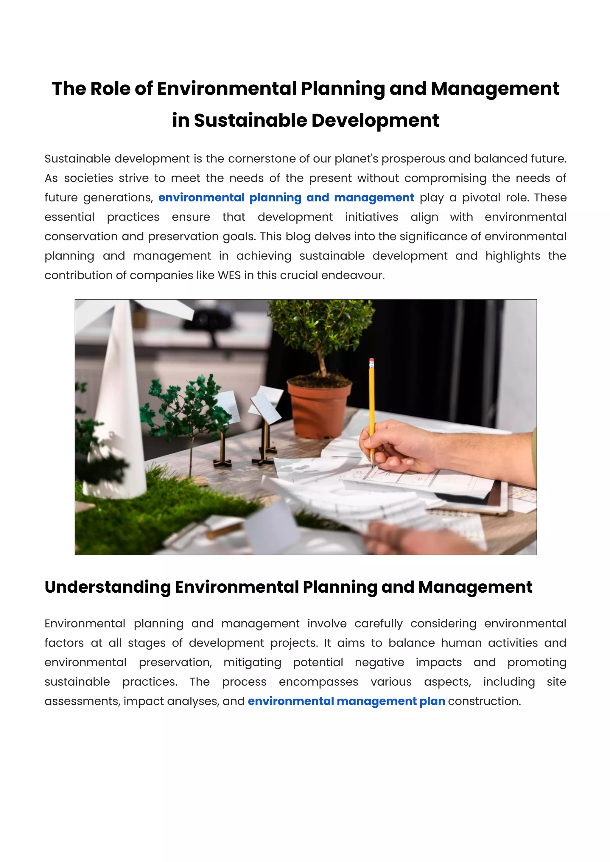 Environmental planning and management are crucial for sustainable development, ensuring that development initiatives align with environmental conservation. These practices include integrating environmental considerations in project planning, conducting environmental impact assessments, and creating construction environmental management plans to minimize negative impacts. Companies like WES play a key role by offering consultancy services that promote responsible construction and sustainable practices.