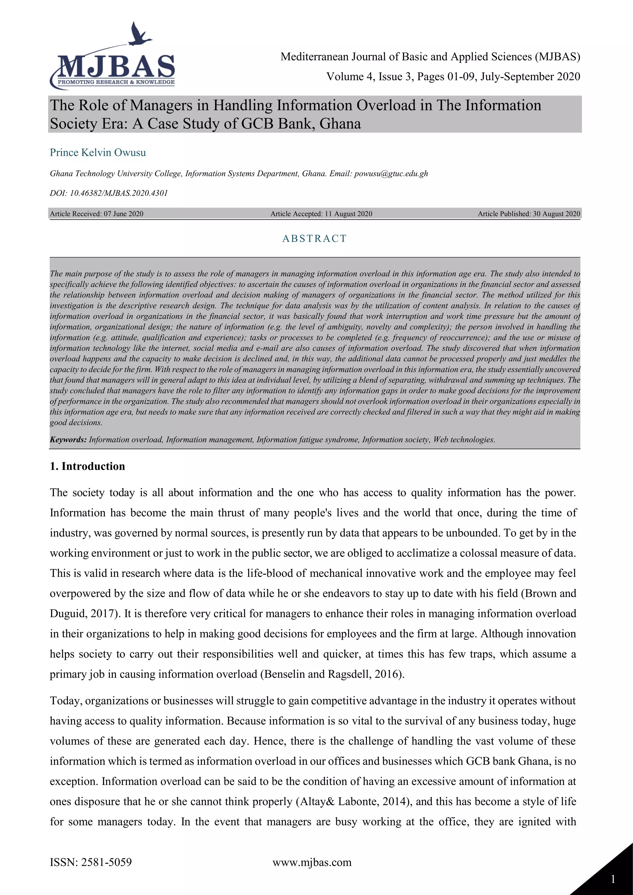 The study examines the role of managers in managing information overload, particularly in the banking sector of Ghana, highlighting how excessive information can hinder decision-making and productivity. It identifies key causes of information overload, such as organizational design and information technology misuse, and emphasizes the necessity for managers to filter information effectively. The research concludes that addressing information overload is essential for enhancing organizational performance and enabling better decision-making.