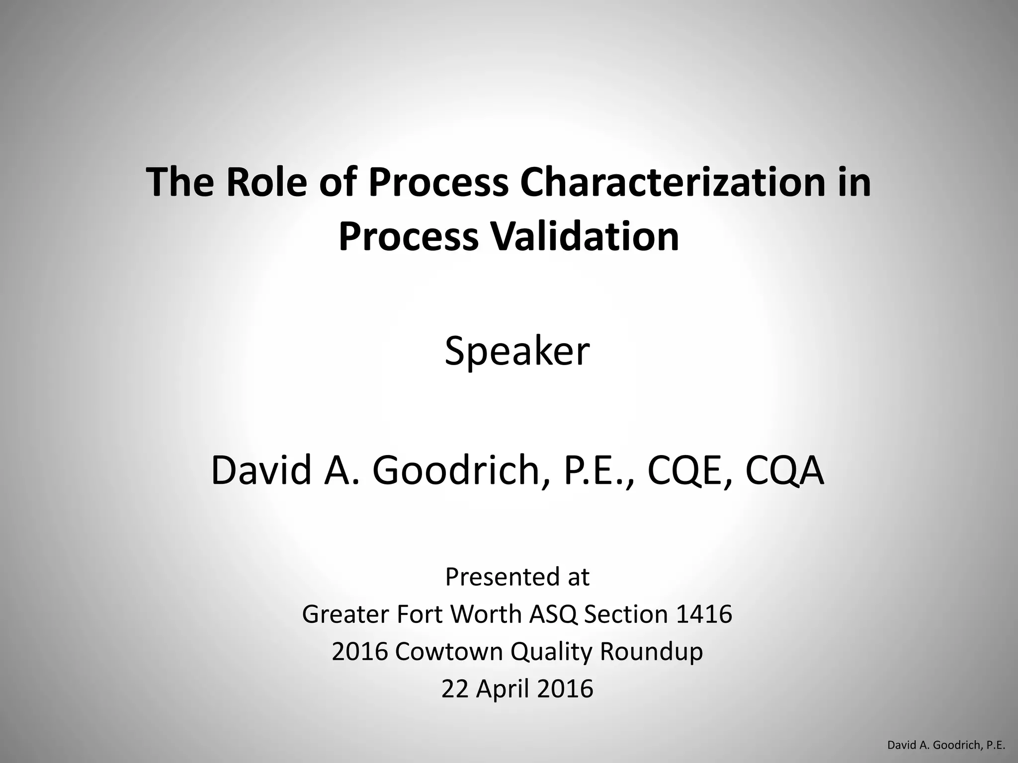 The document discusses the role of process characterization in process validation. It begins by defining process validation and process characterization. Process characterization aims to identify and quantify all significant sources of variation, especially inherent variation in materials and technology as applied to the specific product design. Characterization studies determine how the process performs under worst-case conditions prior to qualification testing. The document then provides two case studies as examples of using design of experiments to characterize processes and identify optimal process settings.