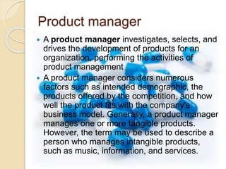 A product manager is responsible for investigating, selecting, and driving the development of products for an organization. They consider factors like the target demographic, competition, and how the product fits the business model. A product manager manages one or more tangible products or intangible products like music or services. Their role is to launch new products and get feedback from clients to help with manufacturing schedules.